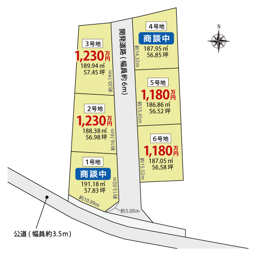 - 接道状況 / 1~6号地:開発道路(幅員約6.0m)・1号地:南側の公道[2項道路](幅員約3.5m)に接する