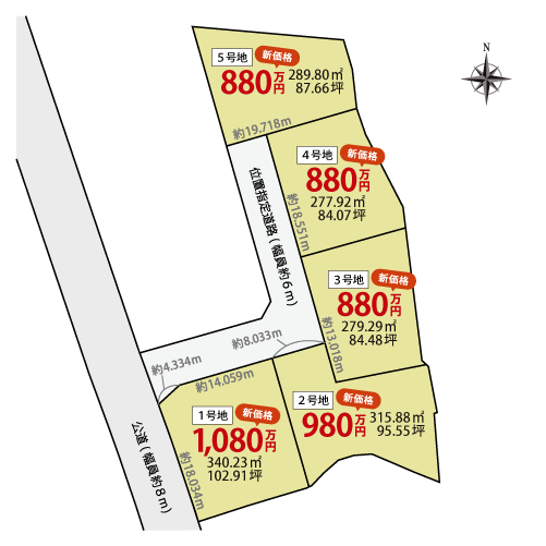 - 接道状況 / 1区画:西側の公道(幅員8m)・1~5区画:位置指定道路(幅員約6.0m)に接する
