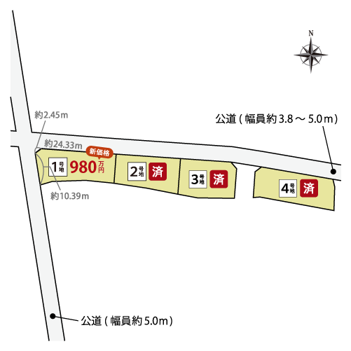 - 接道状況 / 1号地:西側の公道(幅員約5.0m)・北側の公道(幅員約3.8~5.0m)に接する